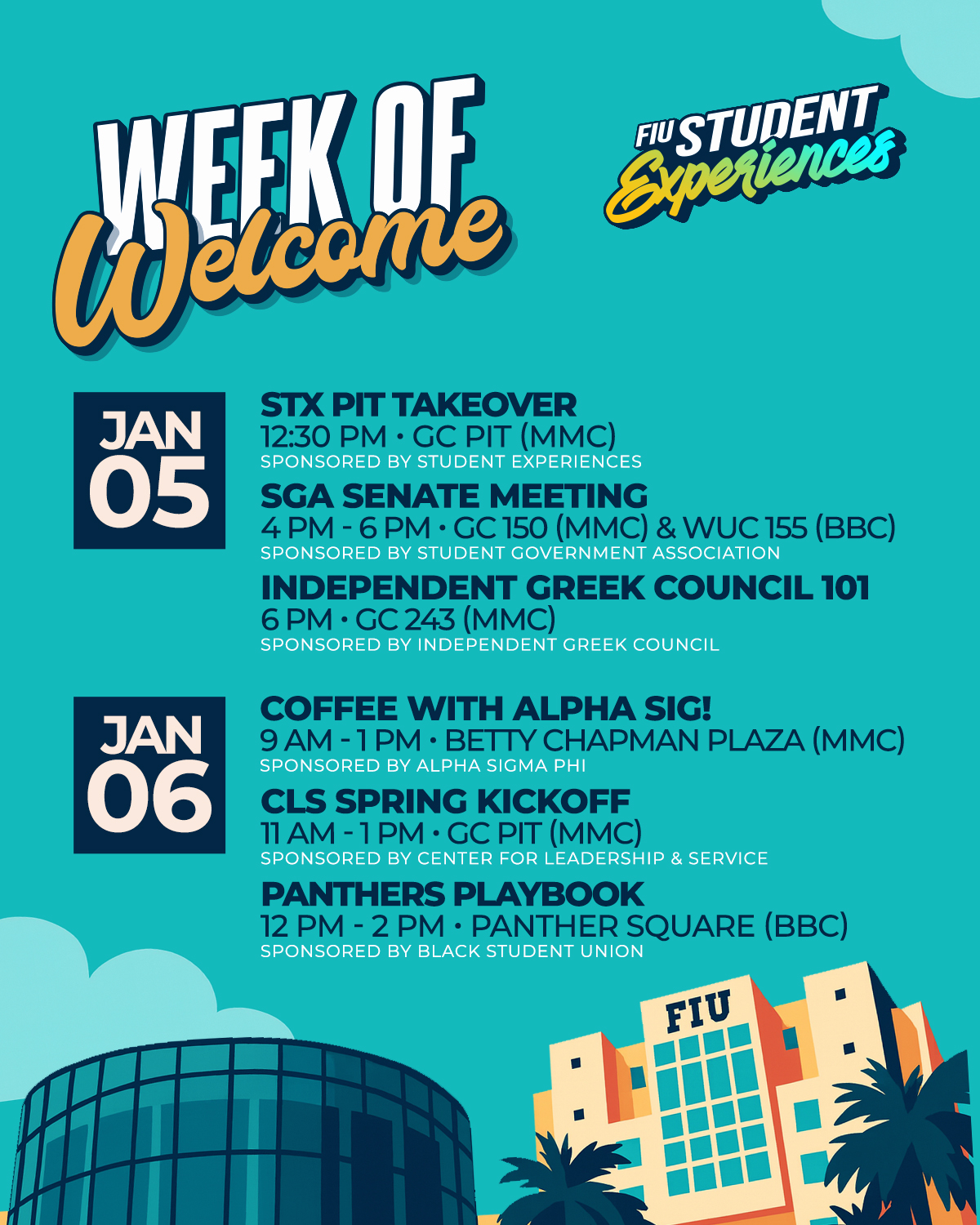 FIU is excited to welcome you to the Spring 2026 semester! We've planned a week's worth of exciting events and information sessions featuring food, fun and giveaways to help you kick off the semester right. There's something for everyone!