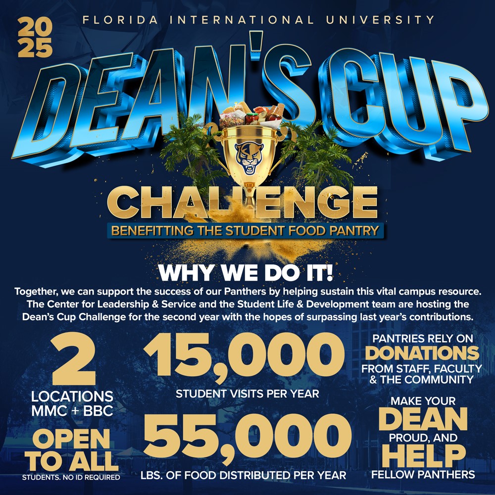 This competition among academic units and their Deans will take place throughout the month of November. We invite the FIU community to support the Student Food Pantries by donating non-perishable items. This year, we have included a virtual option for those who would like to Adopt a Shopping Bag for $25 and contribute monetary donations to the pantry. Visit go.fiu.edu/deanscup2025 , at checkout you’ll be able to share what college you are contributing on behalf of.